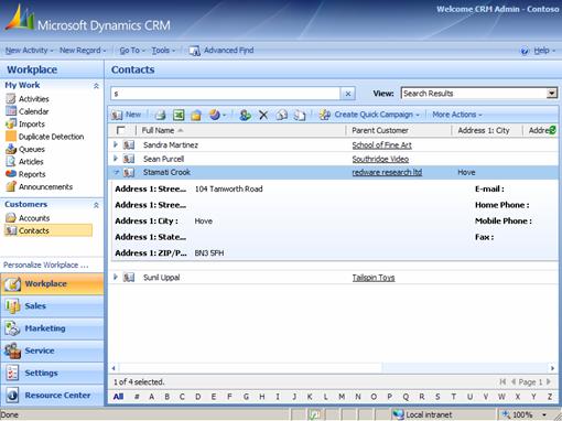 Selecting the workplace-contacts area provides an example of a view of a CRM entity. The selected view shows the appropriate list of contacts (in this case active contacts owned by the currently logged on user).
