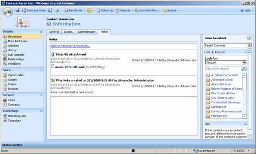 The Notes tab is interesting as this allows date-stamped notes to be recorded and documents to be loaded against the entity by pressing the paperclip icon in the form toolbar.