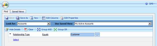 The Advanced Find option on the View page can be used to configure selection criteria to filter data as required. The following screenshot shows how to set up a View on Accounts for relationship type customers only.