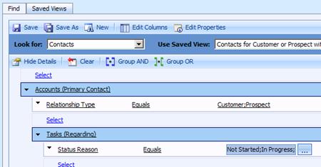 Selection criteria can bring in fields from related entities. The following example filters Contacts for prospects or customers with incomplete Task activities. In this example, the (many-to-one) relationship to the primary account is used to check the relationship category, and the (one-to-many) relationship to Tasks is used to check for the presence of incomplete tasks.