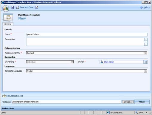 The mail merge wizard appears and you may specify a letter, fax, email or label merge type and optionally choose an existing Word template document stored in CRM.