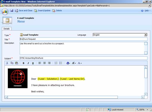 Emails are sent out from the CRM web interface using either SMTP or Exchange (the former are not automatically copied into the Outlook folders). Emails can be typed with simple formatting or created from an email template or knowledge base article (described in the Services chapter).