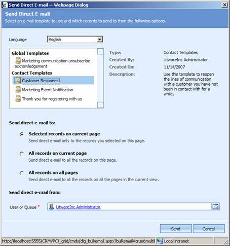 The Send Direct E-mail button is available on the toolbar of some views and allows you to send a template email straight off to one or more contacts without needing to view or edit the emails. Select the required view and control+click to select the required records and then press the Send Direct E-mails button, select the email template, and the emails are sent and automatically stored in the activity history.